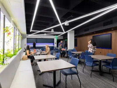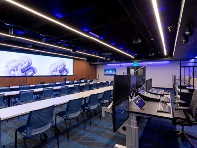 The re-developed space built within a former conference center also features dedicated team rooms, a wellness room, a podcast/video blog studio, a broadcast studio with control room, a tech lounge with collaborative meeting space, and several offices. Construction partners on the project included DLR Group and Erickson Hall Construction.