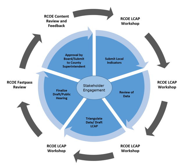 The Riverside County Office of Education provides LCAP development and support to all charter schools in Riverside County. Charter schools are encouraged to adhere to the state recommended timeline for LCAP development and participate in training and support offered as illustrated below.